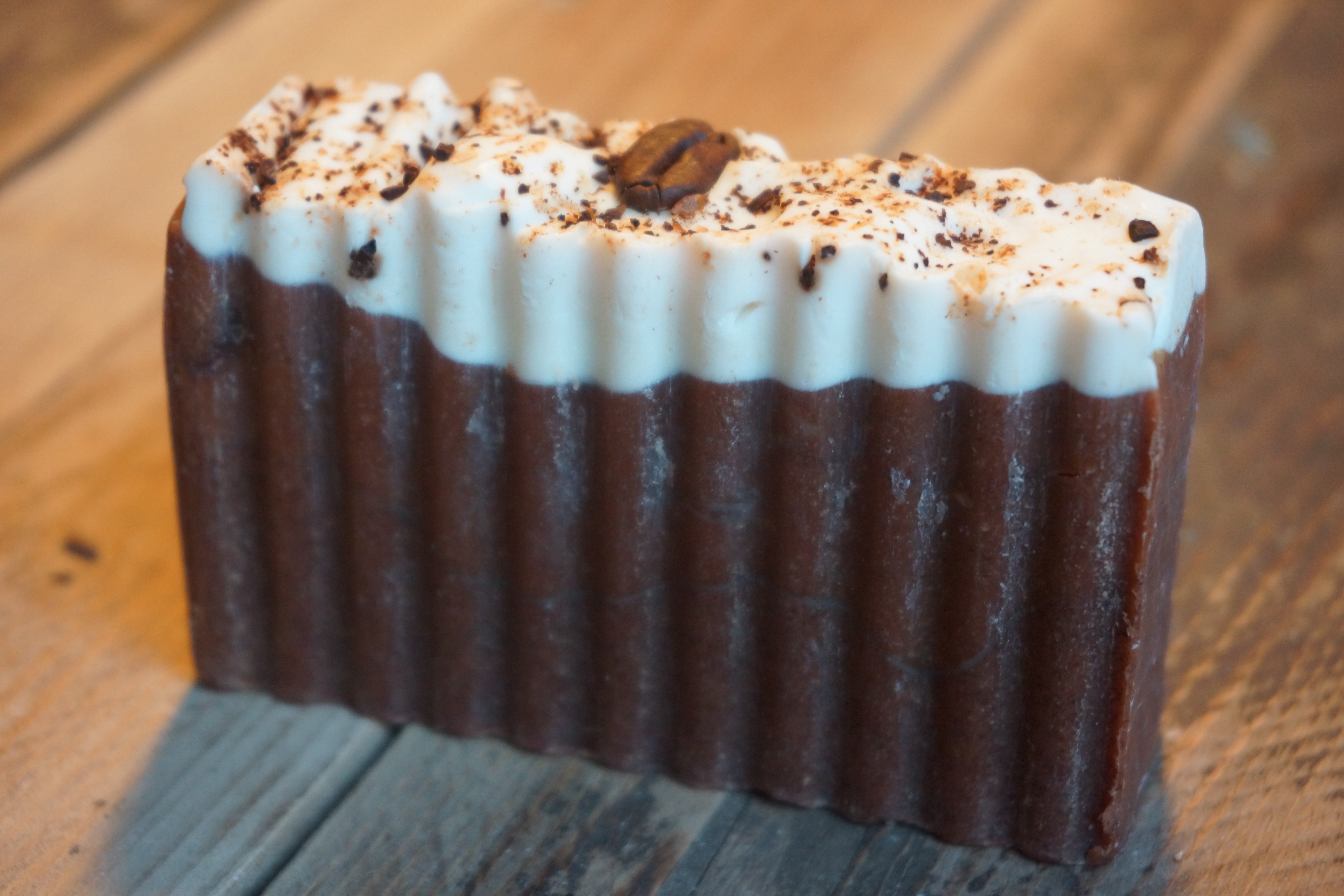 This cold process soap begins with a very simple base of olive oil & coconut oil. It has three layers, the bottom layer has ground cinnamon, making it naturally exfoliating & 100% pure cinnamon essential oil. The middle layer has cocoa added & the top layer has 100% pure orange essential oil & shea butter, it is topped off with a sprinkling of coffee granules, which, when used on the skin, is proving to have more & more beneficial properties.